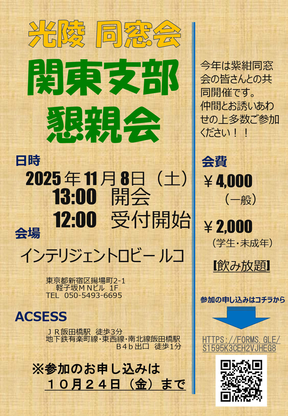 今年で3回目を迎える同窓会関東支部懇親会が11月8日(土)に東京、飯田橋で開催される運びとなりました。
